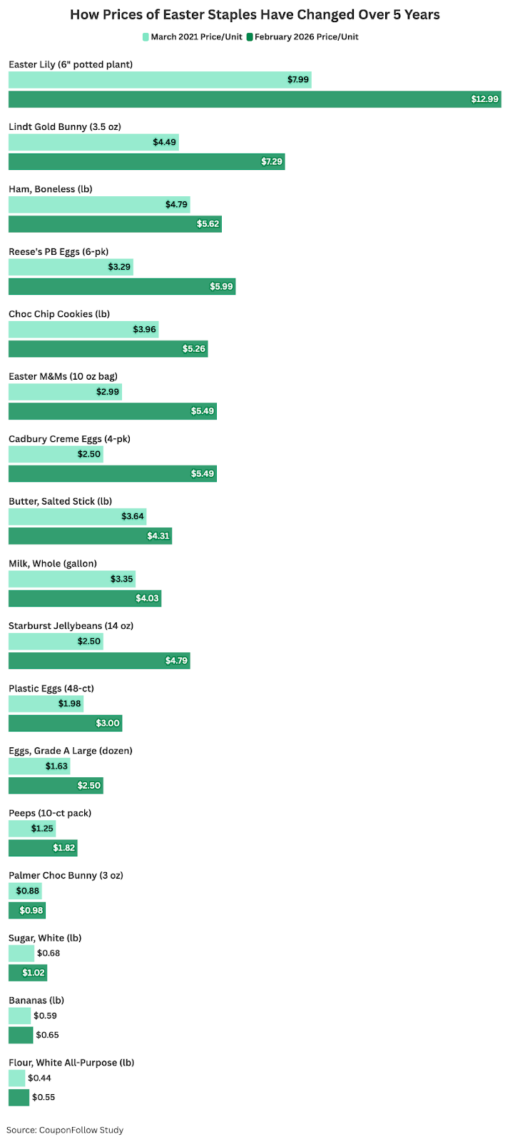 While grocery staples have stayed relatively steady, rising candy and seasonal costs are making Easter baskets and brunches noticeably more expensive this year. But celebrating doesn't have to feel out of reach. With a few thoughtful choices and tools like CouponFollow to help find the best Easter deals, families can still enjoy a full, festive holiday without stretching their budgets too far.