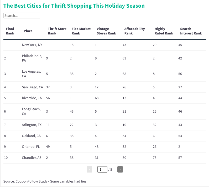 New York, NY, ranks No. 1 overall for thrifting opportunities this holiday season, followed by Philadelphia, PA, and Los Angeles, CA.