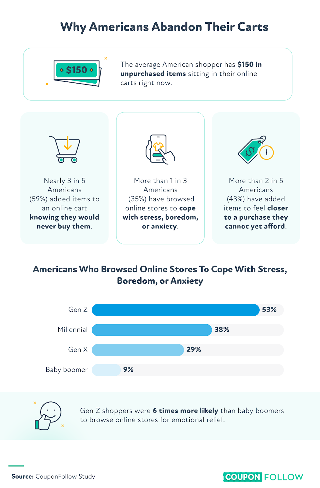 - Beyond price and discounts, 1 in 4 Americans (25%) abandon carts out of guilt about spending money, and more than 1 in 5 (21%) simply get distracted or forget about the purchase.