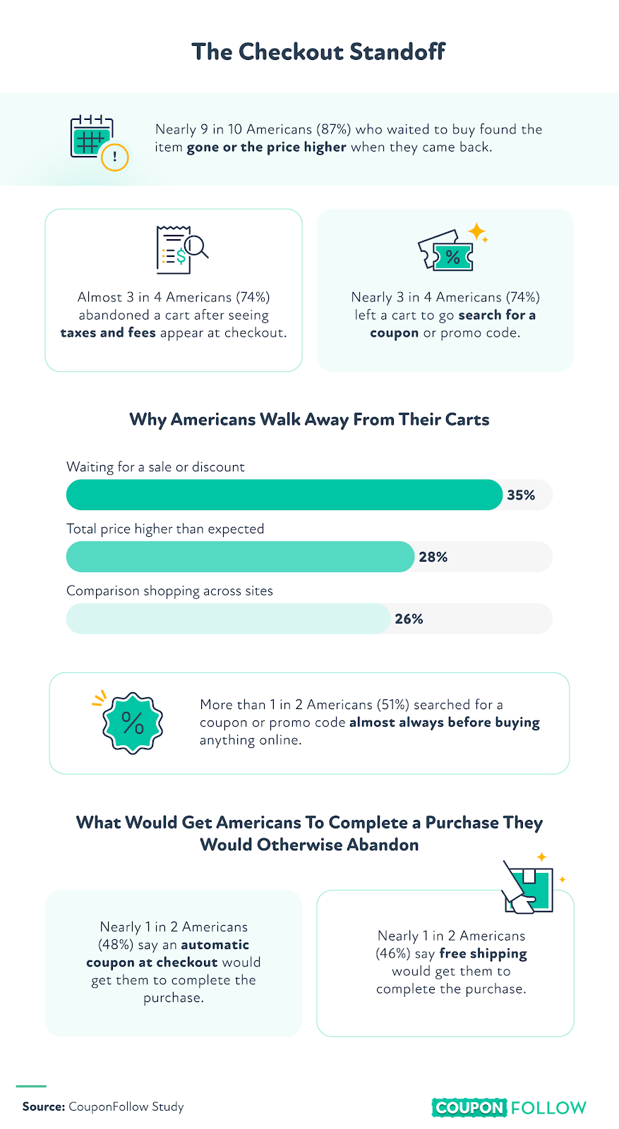 - Nearly 9 in 10 Americans who hold off checking out to wait for a coupon or a lower price come back to find the item sold out or more expensive.